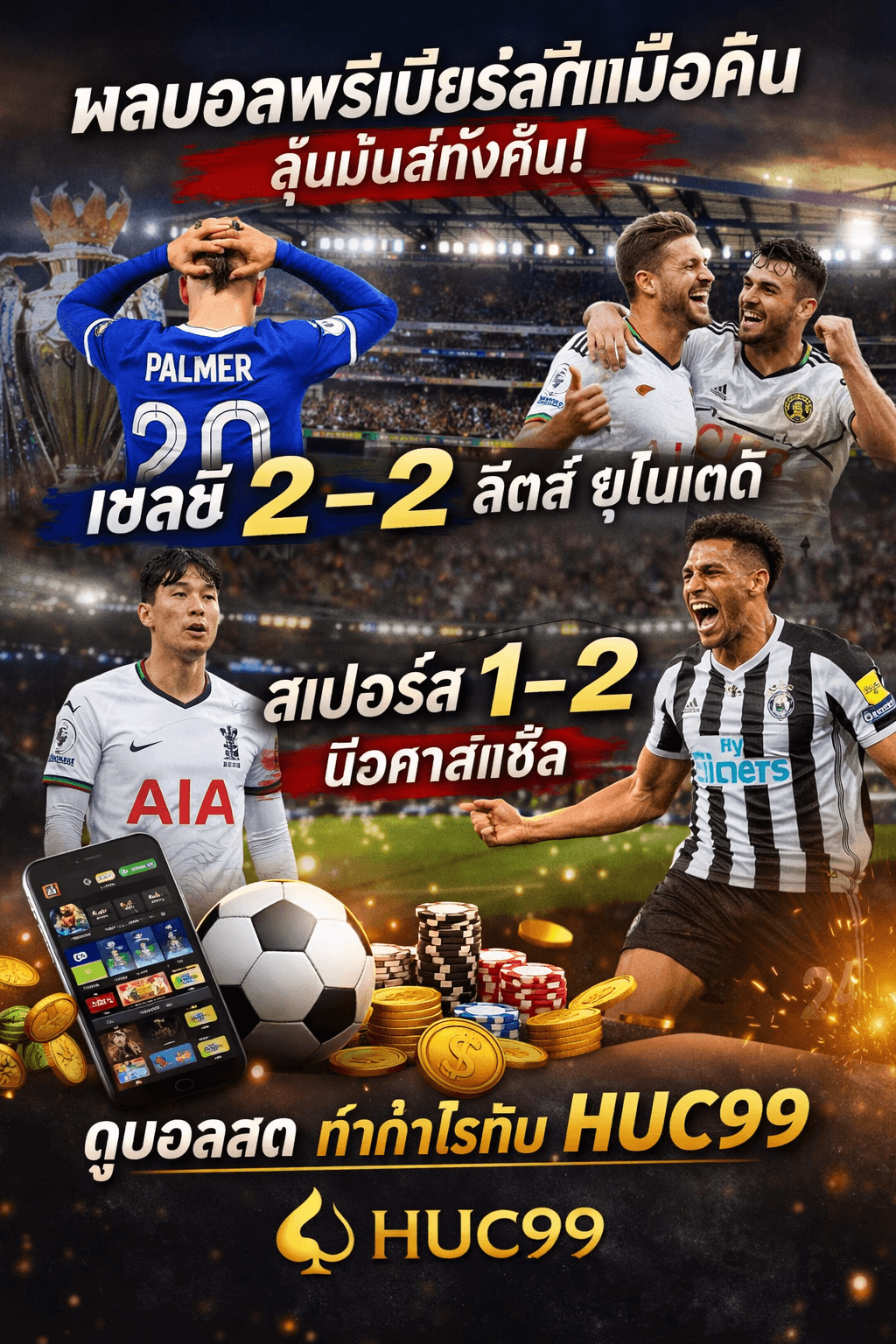 ผลบอลพรีเมียร์ลีกเมื่อคืน ทำเอาแฟนบอลหัวใจเต้นแรงตั้งแต่นาทีแรกจนวินาทีสุดท้าย เชลซีที่นำก่อนสองลูกกลับโดนลีดส์ไล่ตีเสมอแบบเหลือเชื่อ 2-2 ขณะที่สเปอร์สพังคาบ้านให้นิวคาสเซิ่ล 1-2 เกมแบบนี้แหละที่ทำให้ค่ำคืนพรีเมียร์ลีกไม่มีคำว่านอนเร็ว